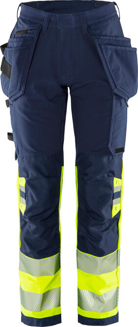 Mere bæredygtige HiVis håndværker stretchbukser til damer, lavet i 4-vejs stretch fra genbrugs- og biobaserede materialer med stretchpaneler i taljen for enestående komfort. Forstærket i udsatte områder for ekstra holdbarhed. Med EPD (Environmental Product Declaration). Koncept: Stiby