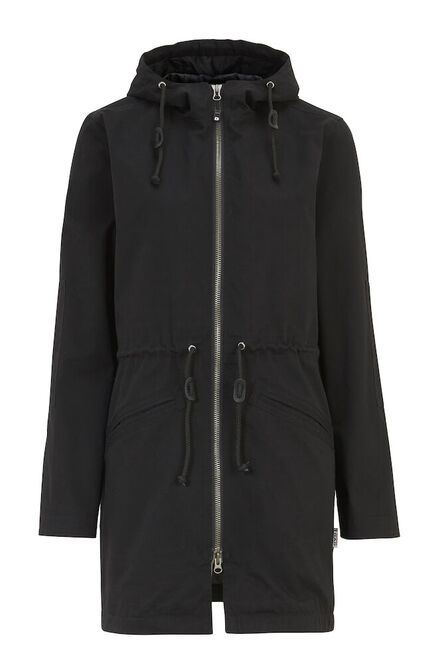 Bomuldsjakke i retrostil med fast hætte. Stilfulde detaljer. YKK lynlås. Damemodel med ekstra længde og snøre med stopper i talje og hætte. Herremodel med snøre og stoppere i hætte og løbegangen i bunden. Foldede lommer med dekorative sømme samt én inderlomme.