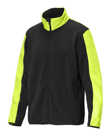 Tofarvet fleecejakke med gennemgående lynlås. Kontrast på ærmer, krave og bag på skuldre. To forlommer med lynlås, dekorative flatlock sømme samt elastisk bånd i ærmer og bund.