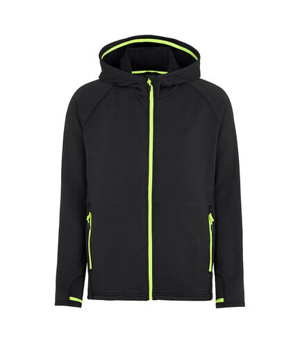 Hættetrøje med gennemgående lynlås, To lommer med lynlås og åbning til tommelfinger i ærmer. Den både varmer og transporterer fugt væk fra kroppen. OEKO-TEX 100 certificeret. Findes både i herre- og damemodel.