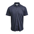 Strikket interlock Oxford skjorte med korte ærmer. Blød og moderne cut-away skjult button down krave, sideslids og foldet ærmer. En moderne og komfortabel strikket Easy Care behandlet skjorte med naturlig stræk samt tone i tone detaljer. Findes i en slim og regular model.