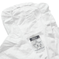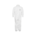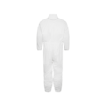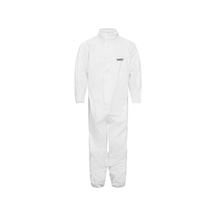 Engangsdragt med hætte, lynlås ved frontåbningen dækket af en klæbeflap, elastiske manchetter, ankler og hætte; tilskårne og syede sømme.