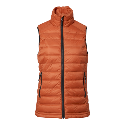 Opdateret letvægtsvest i kvindefacon med stof, polstring og lynlåse lavet af genanvendte materialer. Vesten har to praktiske sidelommer med lynlåse. Elastikbånd med heatprint ved armhulerne. Vesten er en del af "The Mix Concept" og kan bæres separat eller nemt fastgøres til Alma skaljakken eller Alma parka som en mellemlagsvest.
