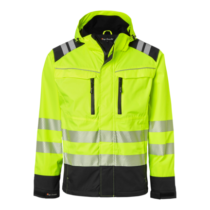 Vind- og vandtæt skaljakke med god ventilation og tapede sømme. Designet for enestående komfort. Yderbeklædning i strækbart stof. Fuld-længde lynlås hele vejen op til kraven. To brystlommer med klapper. Den højre har et ID-kort rum. To brystlommer med vandtætte lynlåse. Stor kortlomme indeni klappen. To forlommer. To indvendige lommer med lynlåse. Ærmekanter med tommelfingerhuller. Justerbar Velcro-manchet. Snøresnor i kanten. Aftagelig og justerbar hætte. EN 343 Klasse 3. EN ISO 20471.